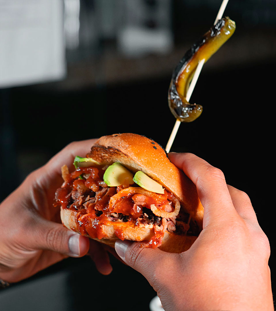 Montadito in our style, mini baguette filled with an ingredient, it can be drowned in our Highway to Hell sauce.