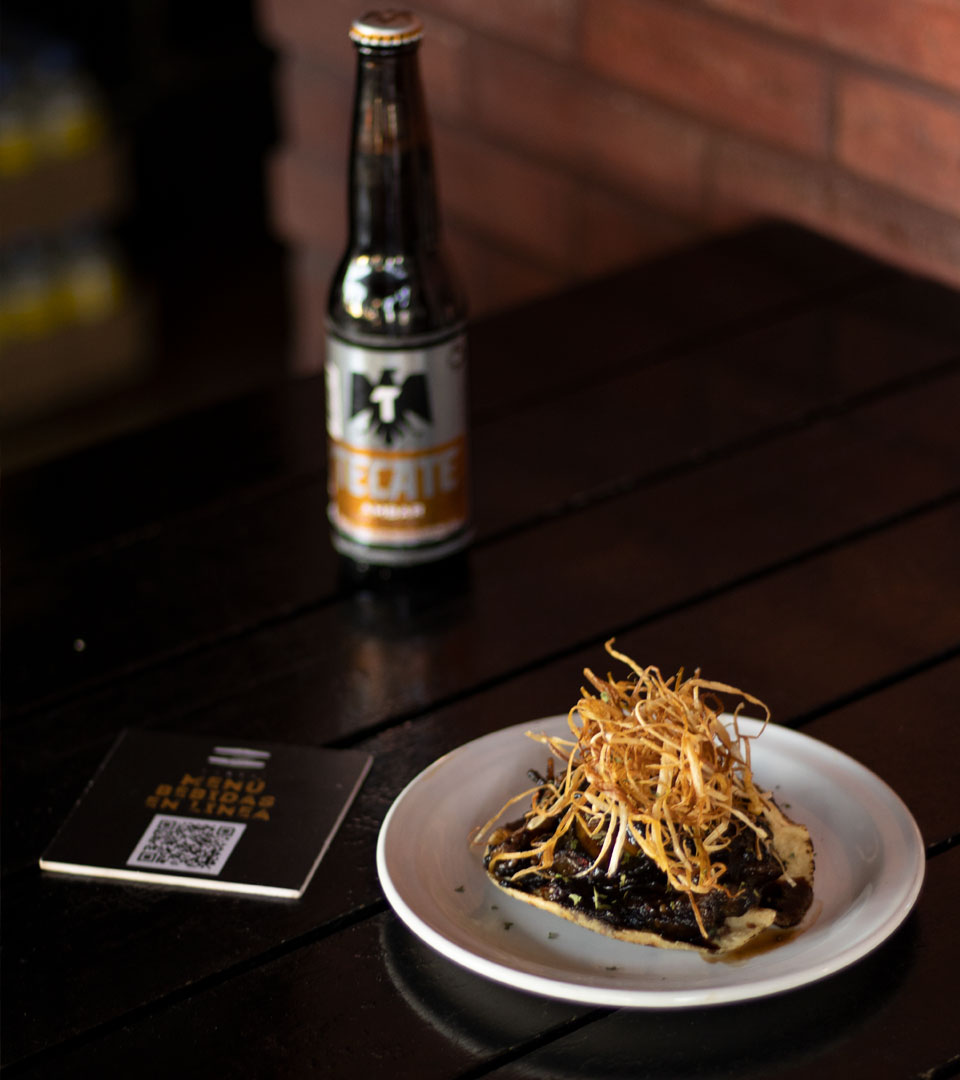 Tostada de maíz, atún fresco con poro, cilantro frito y chipotle.