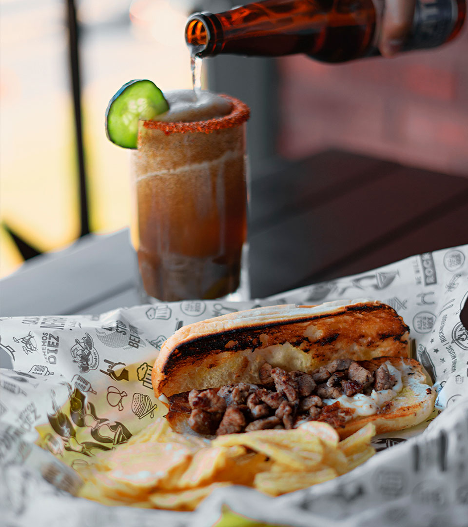 Pan pita a la plancha rellena de Bistec de res acompañado de queso mozzarella y chiles con cebolla marinada en salsas negras.