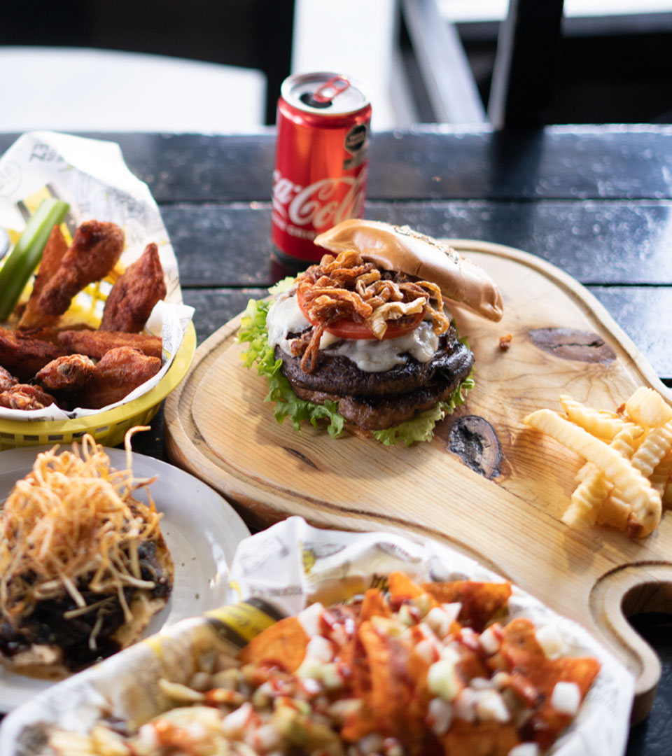 Wings, boneless, drumsticks, hard papas and celery with our hause sauces.