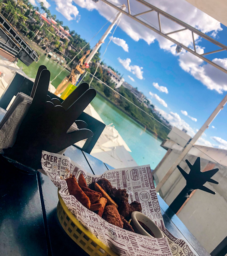 Rockwings, boneless, drumsticks, hard papas y apio con salsas de la casa.